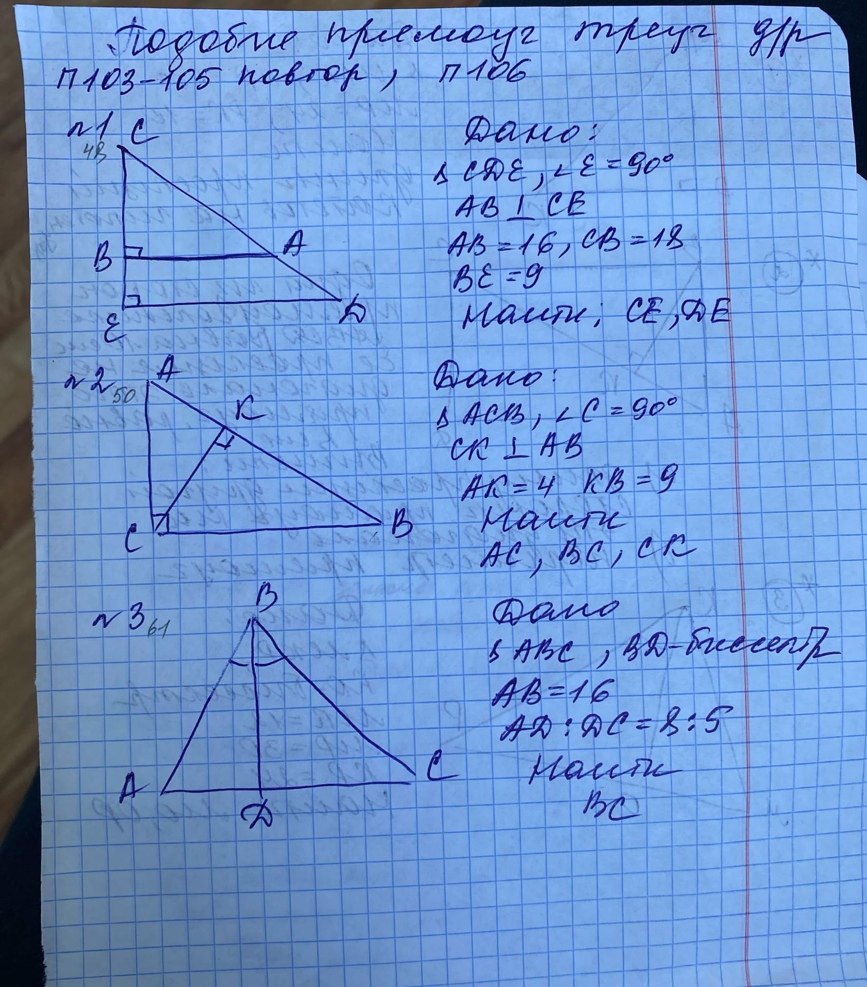 Объясню пока вторую задачу, над первой ещё подумаю.Будем решать через правило "Квадрат гипотенузы равен сумме квадратов катетов".