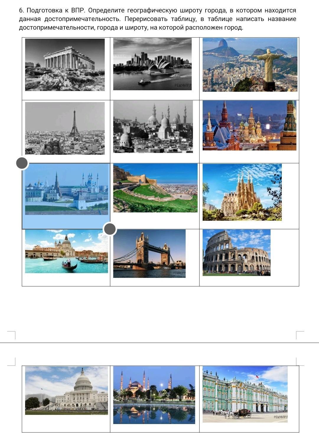 Подготовка к ВПР. Определите географическую широту города, в котором находится данная достопримечательность. Перерисовать таблицу, в таблице написать название достопримечательности, города и широту, на которой расположен город.