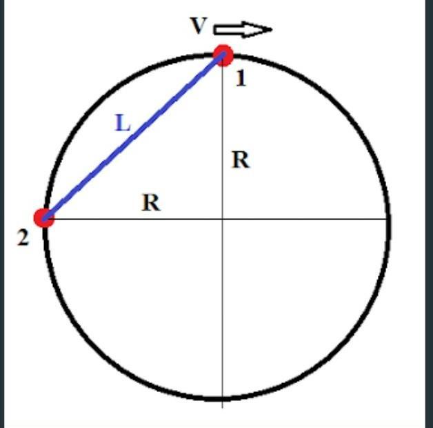 Перемещение - это разность между конечным и начальным положением. Посмотрим на рисунок. Перемещение (синим цветом) - это гипотенуза прямоугольного треугольника с катетами, равными радиусу орбиты. Согласно теореме Пифагора: