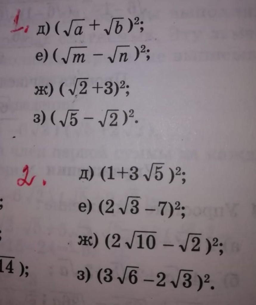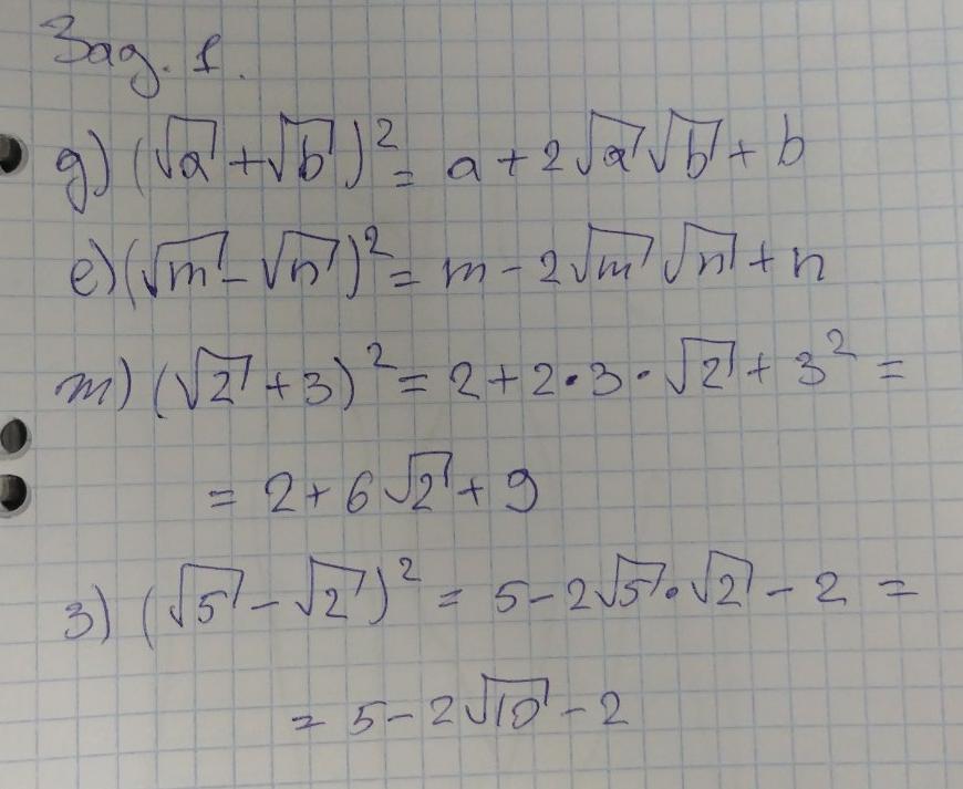 В общем, суть задания - раскрытия скобок с помощью квадрата по формуле (a+b)^2=(a^2+2ab+b^2), если минус, то в первом слагаемом минус, потом работа с корнями. Над номером два думать надо, не помню свойства корней, сори.
