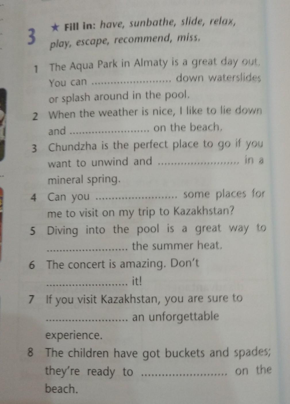 3 * Fill in: have, sunbathe, slide, relax, play, escape, recommend, miss. 1 The Aqua Park in Almaty is a great day out You can ...... ...... down waterslides or splash around in the pool. 2 When the weather is nice, I like to lie down and ...... ...... on the beach. 3 Chundzha is the perfect place to go if you want to unwind and ....... ..... in a mineral spring 4 Can you ... some places for me to visit on my trip to Kazakhstan? 5 Diving into the pool is a great way to ..... the summer heat. 6 The concert is amazing. Don't ... it! 7 If you visit Kazakhstan, you are sure to ........ an unforgettable experience. 8 The children have got buckets and spades; they're ready to ........ beach. ... on the