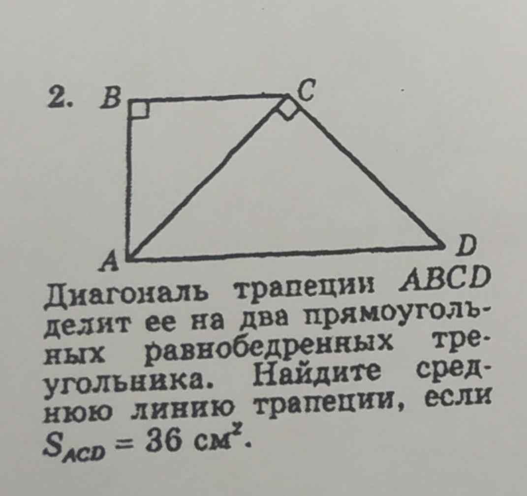 диагональ трапеции ABCD делит её на два прямоугольных равнобедренных треугольника. найдите среднюю линию трапеции, если Sacd=36см2