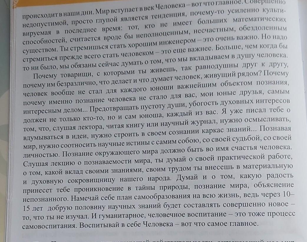 делом». Прочитайте письмо Василия Сухомлинского к сыну. Какое знание известный педагог считает самым главным? Что имеет в виду В. Су- хомлинский, говоря, что мы вступаем в «век Человека»? Каким вы представляете себе этот век? Какими нравственными качествами будут обладать Люди? Какие условия для жизни будут у детей, стариков? Каково будет место природы, животных в этом мире? Напишите ответ великому педагогу, задайте ему вопросы, которые волнуют вас, об истине, смысле человеческой жизни, предназначении человека.