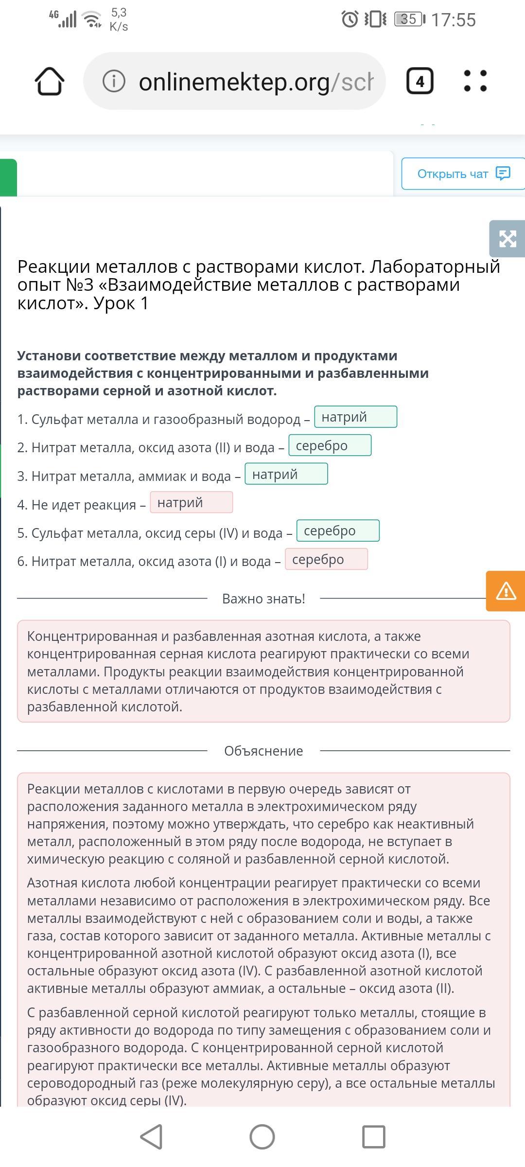 Установи соответствие между металлом и продуктами взаимодействия с концентрированными и разбавленными растворами серной и азотной кислот.