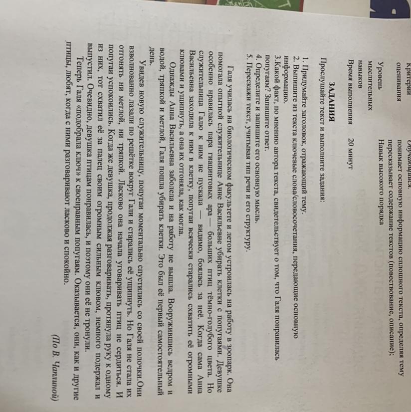 2. Галя училась на биологическом факультете и летом устроилась на работу в зоопарк. Однажды Анна Васильевна заболела и на работу не пришла. Вооружившись ведром и водой, тряпкой и метлой, Галя пошла убирать клетки. Это был ее первый самостоятельный день. Увидев новую служительницу, попугаи моментально спустились со своей полочки. Ласково она уговаривала птиц не сердиться. И попугаи успокоились. Теперь Галя "подобрала ключ" к своенравным попугаям