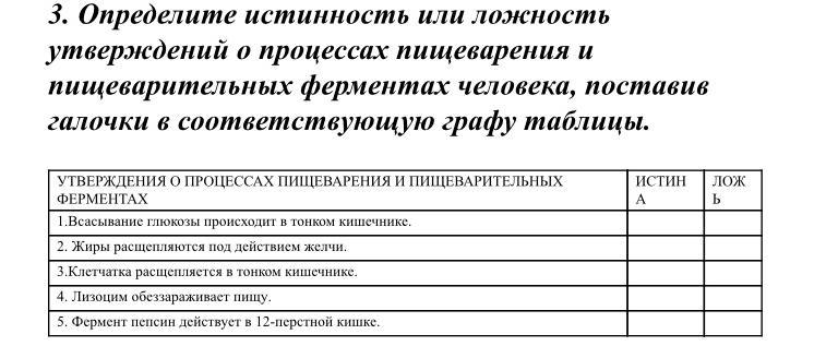Определите истинность или ложность утверждений о процессах пищеварения и пищеварительных ферментах человека, поставив галочки в соответствующую графу таблицы.