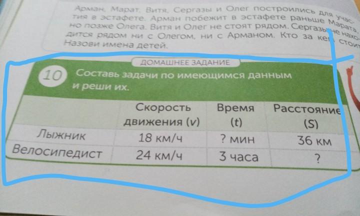 Составь задачи по имеющимся данным и реши их. Лыжник Велосипедист Скорость движения (v) 18 км/ч 24 км/ч Время (t) Расстояние (S) 36 КМ ? 2 мин 3 часа
