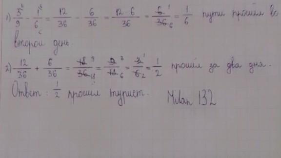1) 3/9 - 1/6 = 12/36 - 6/36 = 6/36 = 1/6 (часть) - пути прошёл во второй день