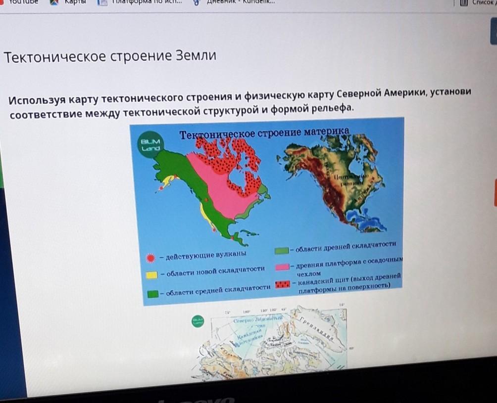 Тектоническое строение Земли Используя карту тектонического строения и физическую карту Северной Америки, установи соответствие между тектонической структурой и формой рельефа.