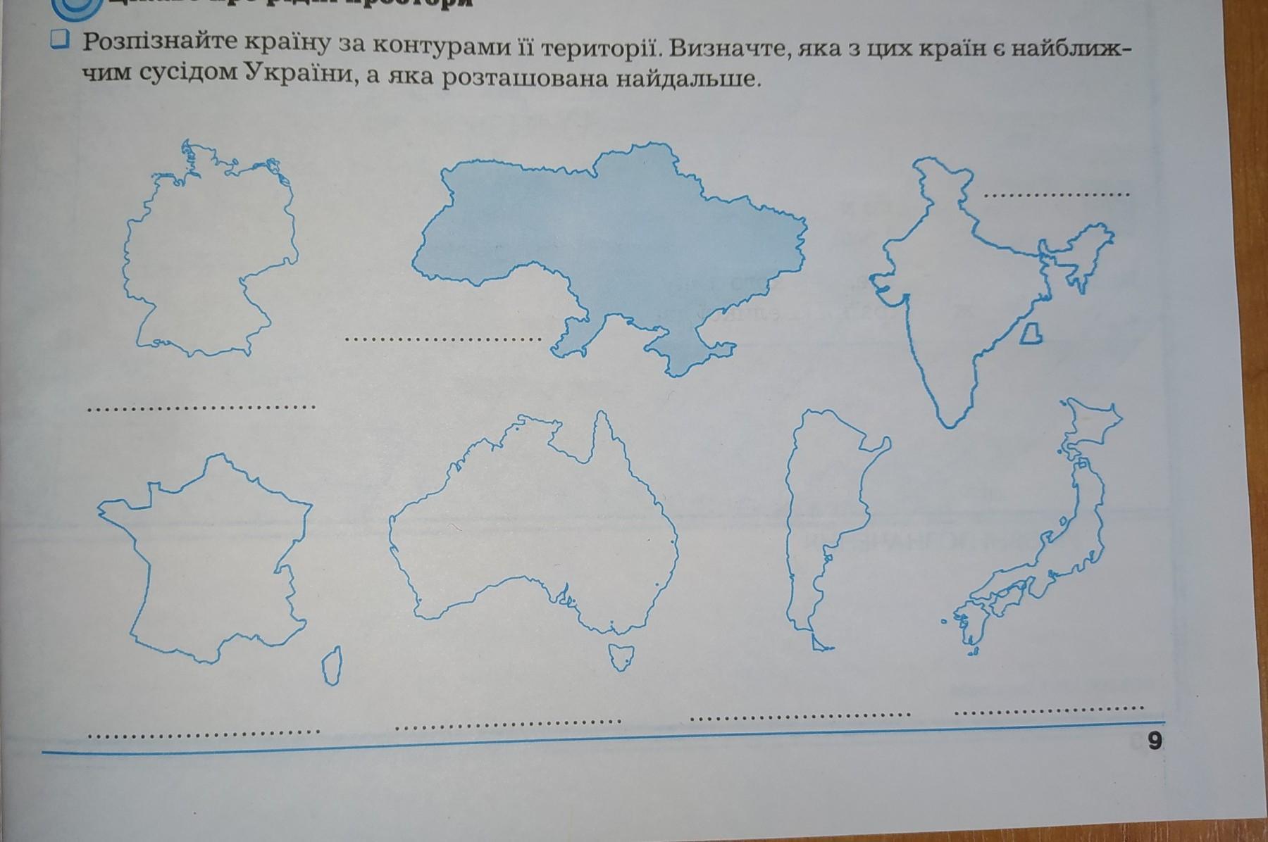 Распознайте страну по контурам ее территории. Определите, какая из этих стран является ближай чем соседом Украины, а расположенная дальше всех.