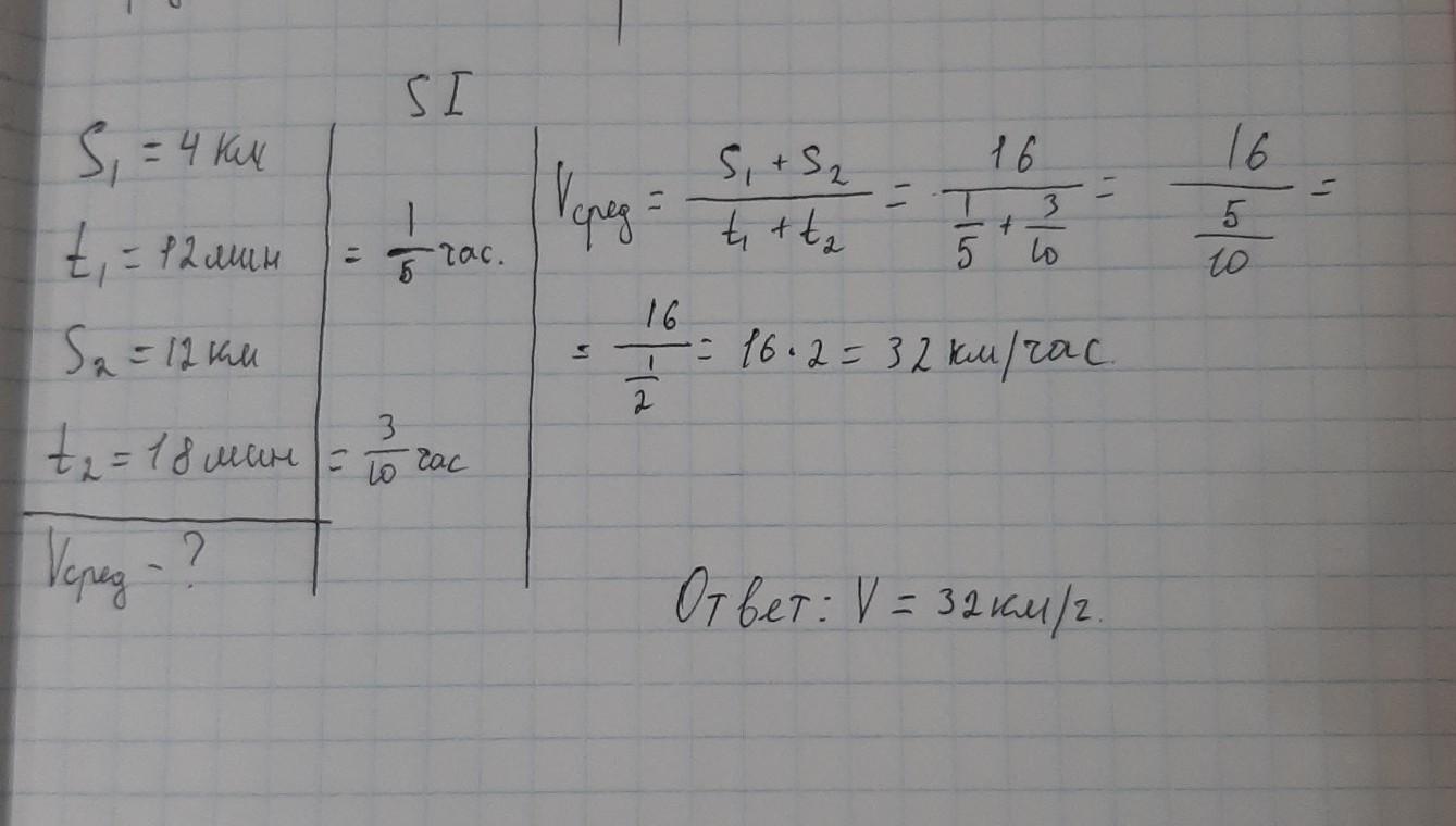 181. Первые 4 км пути автобус проехал за 12 мин, а следующие 12 км - за 18 мин. Найдите среднюю скорость автобуса на каждом участке пути и на всем пути.
