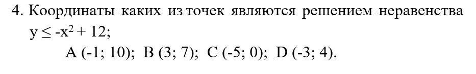 4. Координаты каких из точек являются решением неравенства у ≤ -х2 + 12; A (-1; 10); B (3; 7); C (-5; 0); D (-3; 4).
