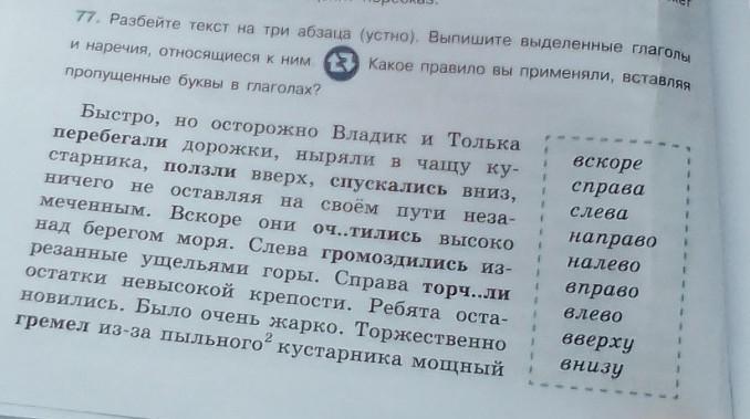 Ответ: перебигали (как?) быстро, ползли (куда?) вверх, спускались (куда?) вниз, очутились (где?) высоко, громоздились (от куда?) слева, торчали (от куда?) справа.