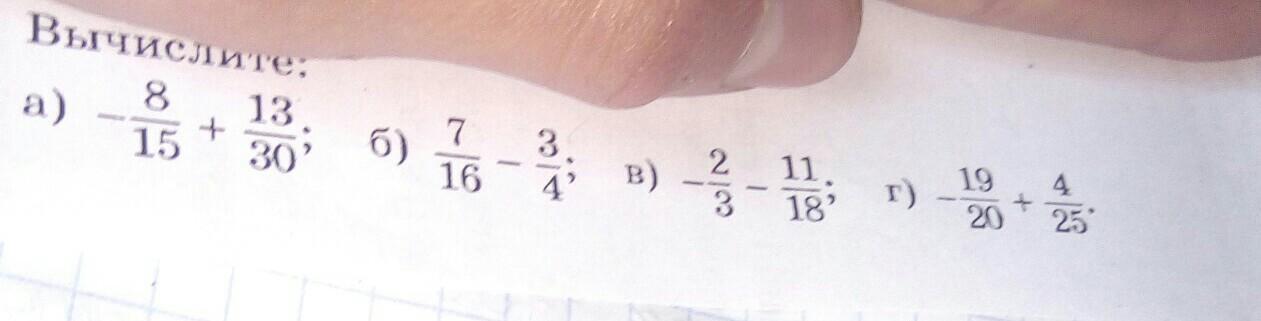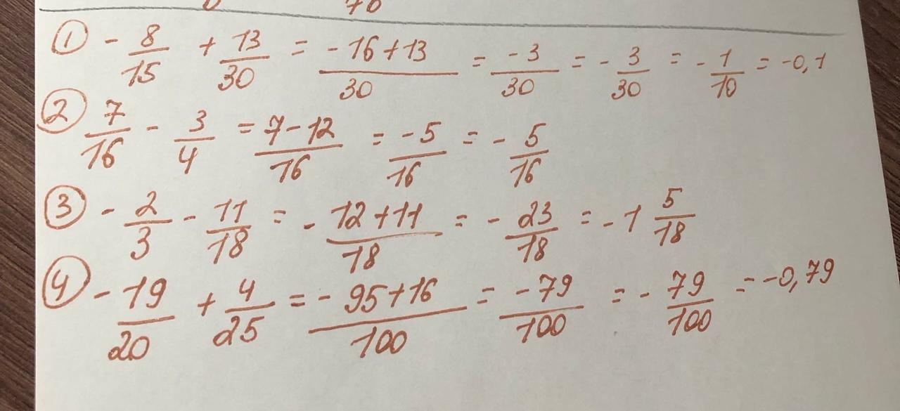 а) -8/15 + 13/30 = -16/30 + 13/30 = -3/30 = -1/10
