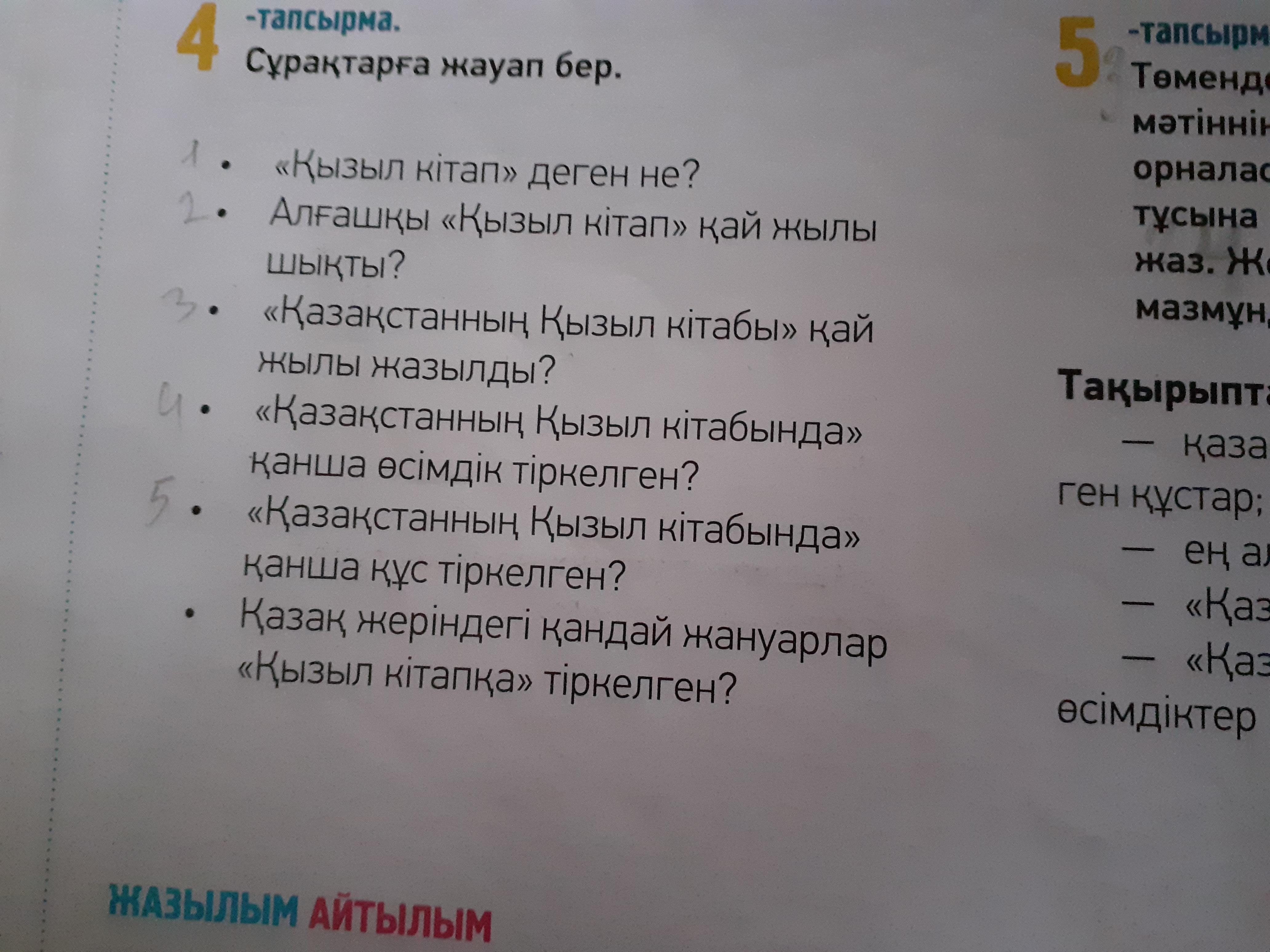 1)Қызыл кітап — халықаралық табиғат қорғау одағының “Қызыл кітабы” — халықаралық дәрежедегі құжат. Қызыл кітапқа сирек кездесетін, жылдан жылға азайып не жойылып бара жатқан, сондықтан да айрықша қорғауды қажет ететін жануарлар мен өсімдіктердің түрлері тіркеледі