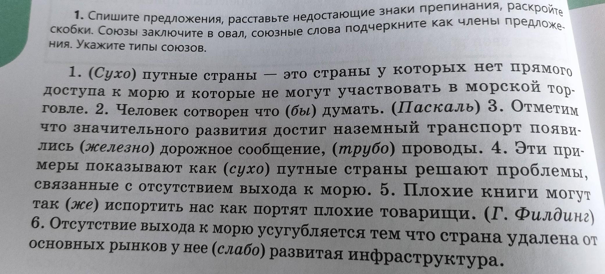 1. Спишите предложения, расставьте недостающие знаки препинания, раскройте скобки. Союзы заключите вовал, союзные слова подчеркните как члены предложе. ния. Укажите типы союзов. 1. (Сухо) путные страны это страны у которых нет прямого доступа к морю и которые не могут участвовать в морской тор- что значительного развития достиг наземный транспорт появи- говле. 2. Человек сотворен что (бы) думать. (Паскаль) 3. Отметим - лись (железно) дорожное сообщение, (трубо) проводы. 4. Эти при- меры показывают как (сухо) путные страны решают проблемы, так (же) испортить нас как портят плохие товарищи. (Г. Филдинг) 6. Отсутствие выхода к морю усугубляется тем что страна удалена от основных рынков у нее (слабо) развитая инфраструктура. связанные с отсутствием выхода к морю. 5. Плохие книги могут