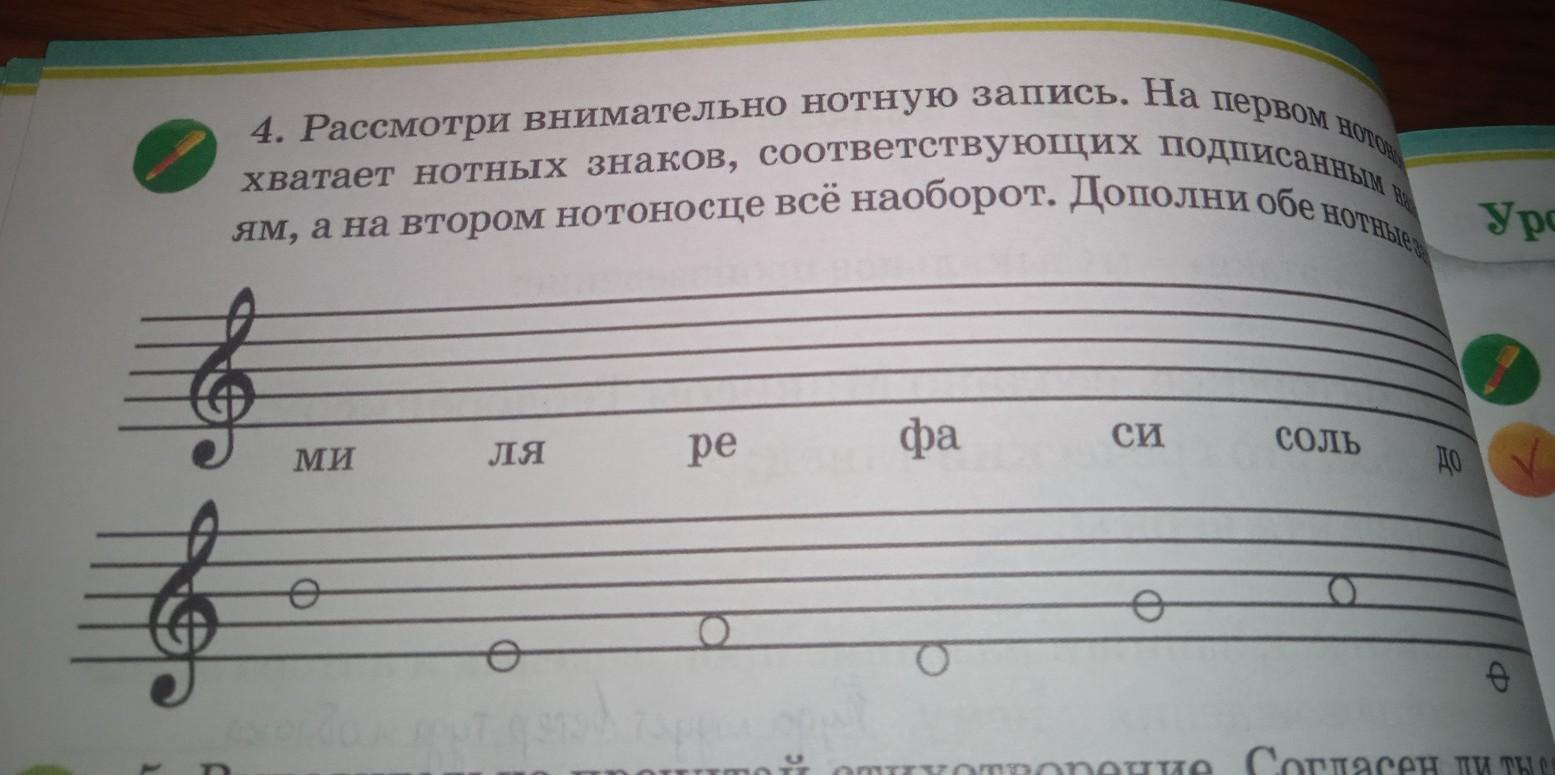 Рассмотри внимательно нотную запись.На первом нотоносце не хватает нотных знаков,соответсвующих подписанным названиям , а на втором нотоносце все наоборот.Дополни обе нотные записи.
