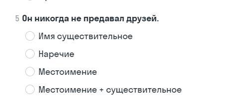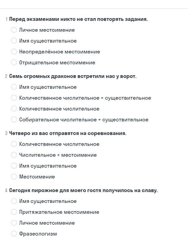 1 - отрицательное местоимение, 2 - количественое числительное + существительное, 3 - количественое числительное, 4 - существительное, 5 - местоимение