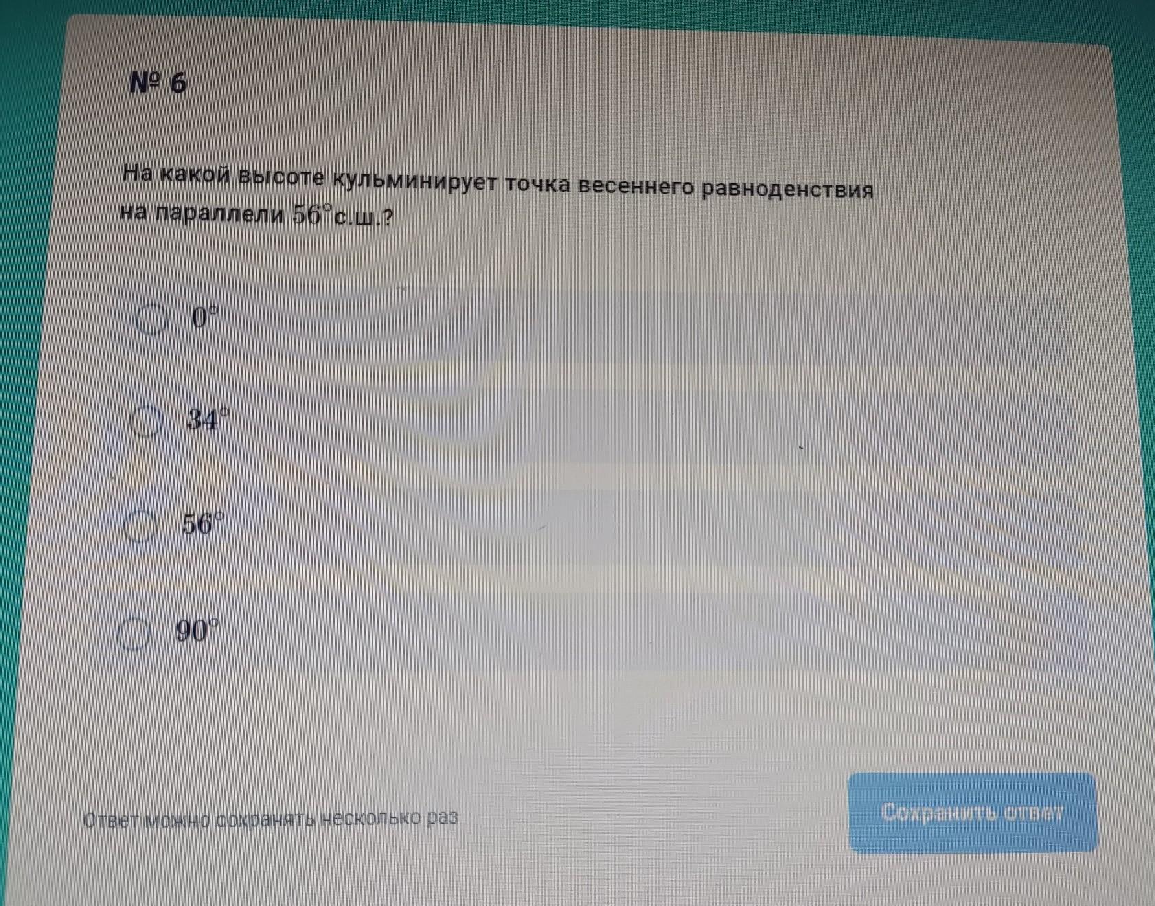 на какой высоте кульминирует точка весеннего равноденствия на параллели 56°с.ш.?