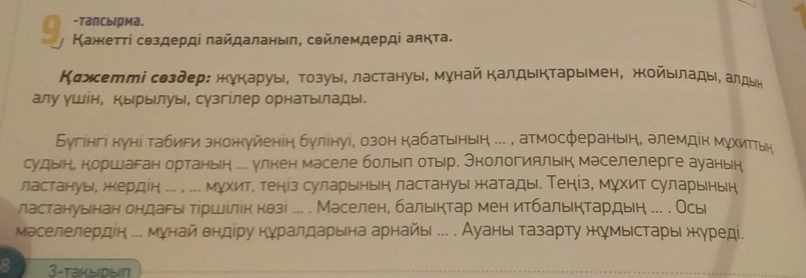9-тапсырма Кажеттi создерді пайдаланып, сойлемдердi аякта. Кажеттi создер: жукаруы, тозуы, ластануы, мукай калдыктарымен, жойылады, алдын алу ушiн, кырылуы, сузгiлер орнатылады. ПОМОГИТЕ