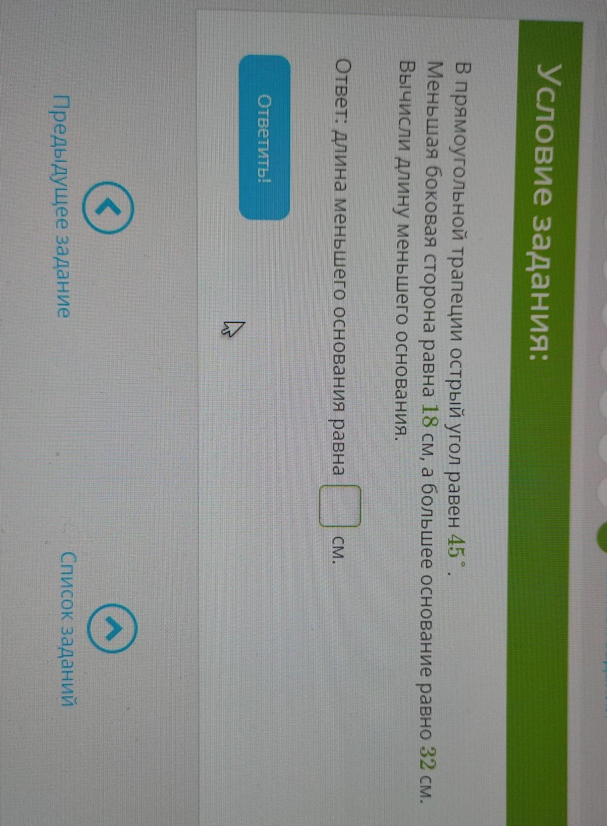 У трапеції ABCD ∠ A = 90° , ∠ D = 45° , AB = 18 см ; AD = 32 см ; ВС - ?