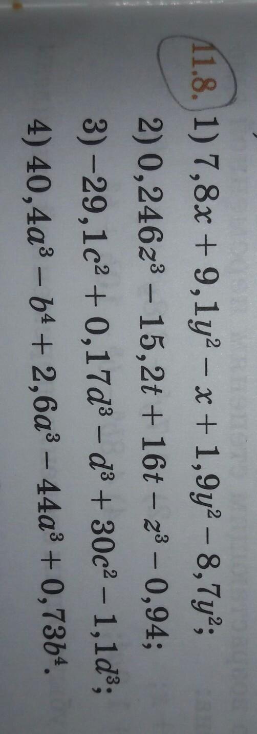 1.8. 1) 7,8x + 9,1y2 - x + 1,9y2 - 8,7ya; 2) 0,24623 - 15,2t + 16t - 23 - 0,94; 3) -29,1c2 + 0,17d3 - d + 30c2 - 1,1d3; 4) 40,4a3 - 64 + 2,6a3 - 44a3 +0,7364.
