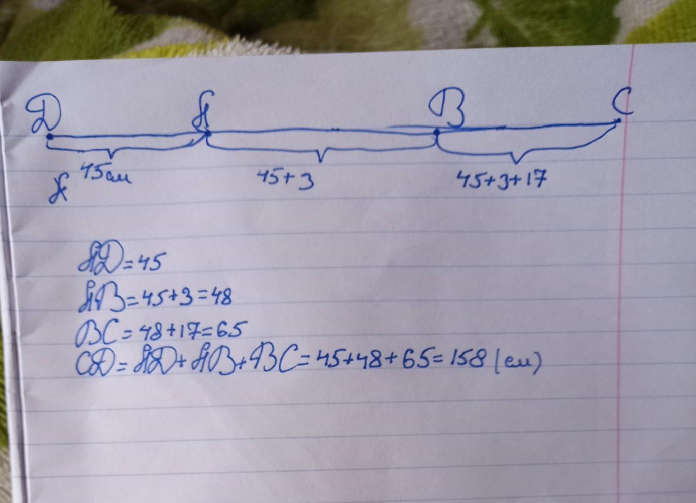 2. Точка В лежит между точками А и С, а точка А — между точками D и B. Найдите длину отрезка CD, если AD 45 см, АВ на 3 см больше AD, а ВС на 17 см больше АВ.