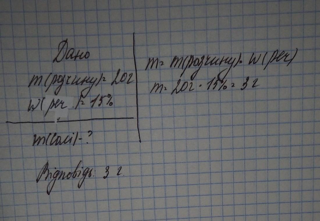 Скільки грам солі потрібно взяти, щоб приготувати 20 г розчину з масовою часткою 15%