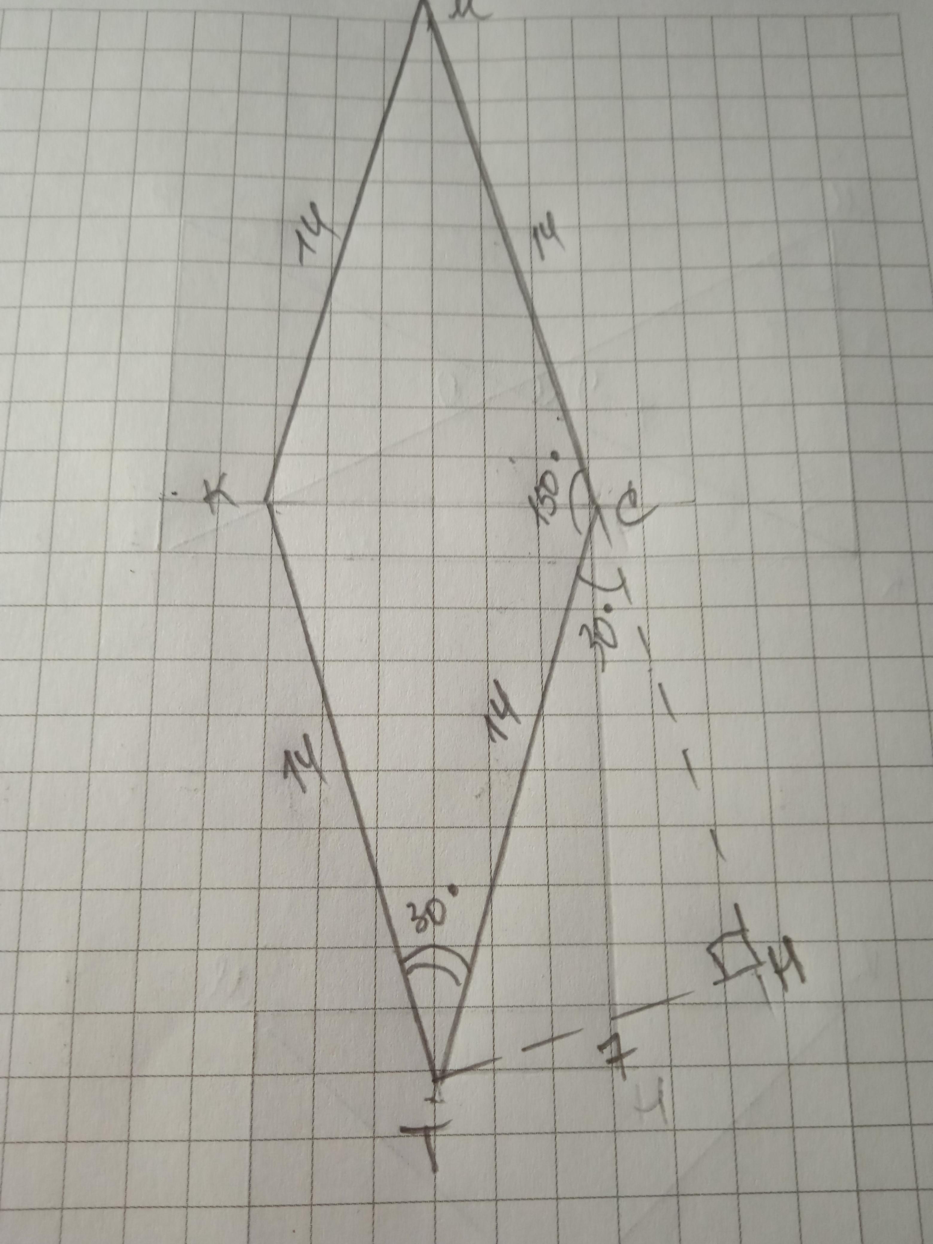 Дано: КМСТ - ромб, ТН - висота, ТН=7 см; ∠МСТ-∠КТС=120°. Знайти Р.