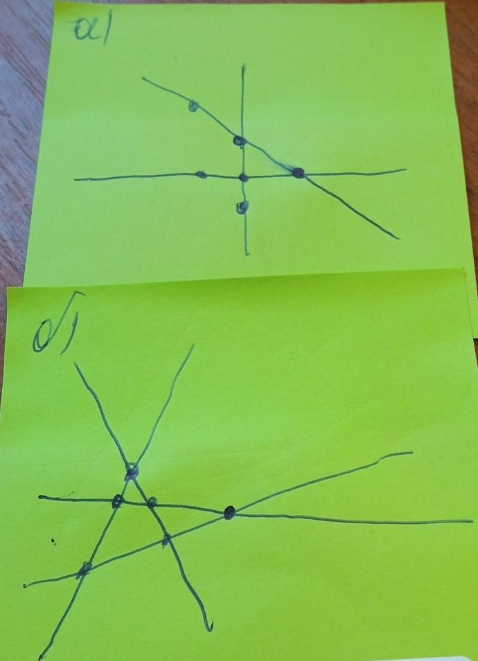 а) Нарисуйте 3 прямые линии и отметьте на них 6 точек так, чтобы на каждой линии было по 3 отмеченных точки. б) Нарисуйте 4 прямые линии и отметьте на них 6 точек так, чтобы на каждой линии было по 3 отмеченных точки(будет неправильно сразу кик)