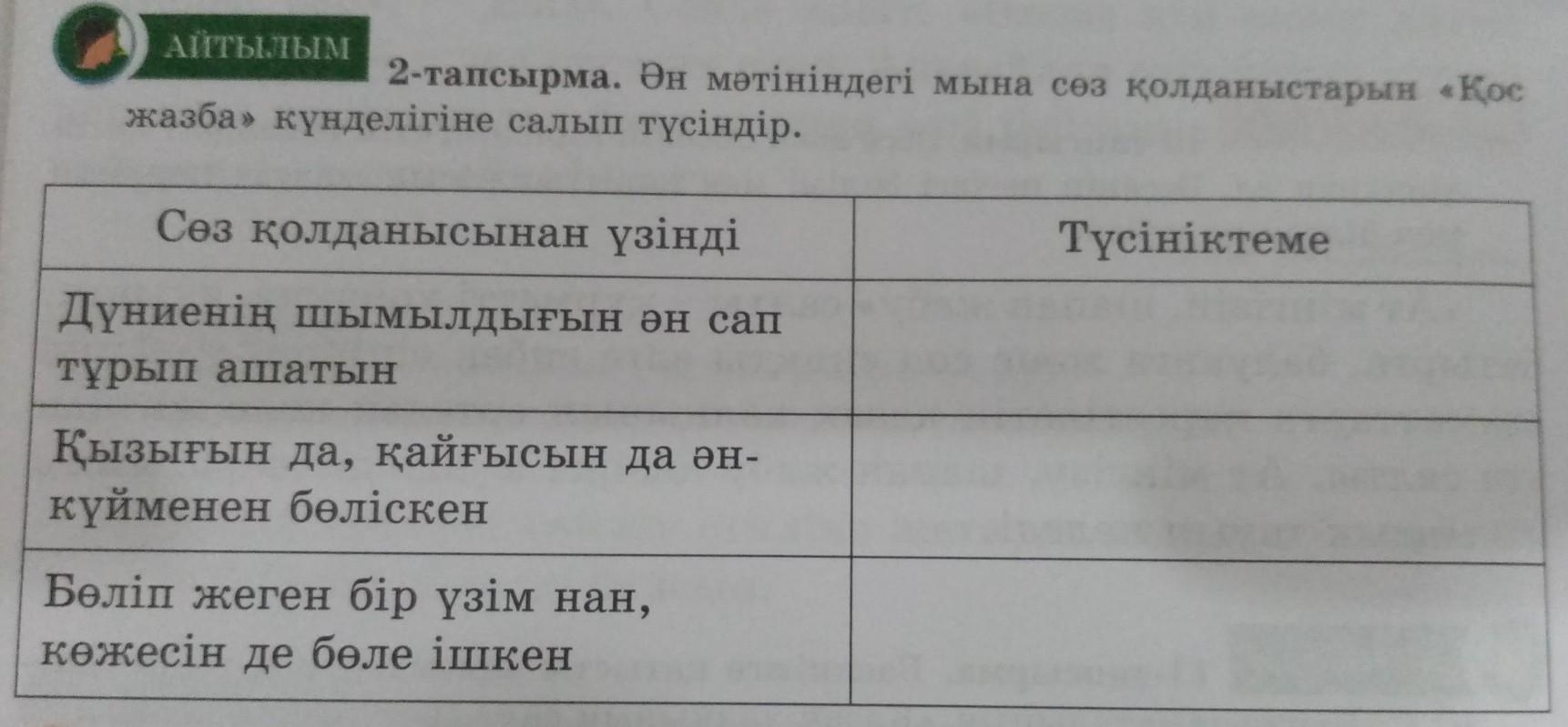 АЙТЫЛЫМ 2-тапсырма. Ән мәтініндегі мына сөз қолданыстарын «Қос жазба» күнделігіне салып түсіндір. Сөз қолданысынан үзінді Түсініктеме Дүниенің шымылдығын ән сап тұрып ашатын Қызығын да, қайғысын да ән- күйменен бөліскен Бөліп жеген бір үзім нан, көжесін де бөле ішкен. Пж пж пж быстро