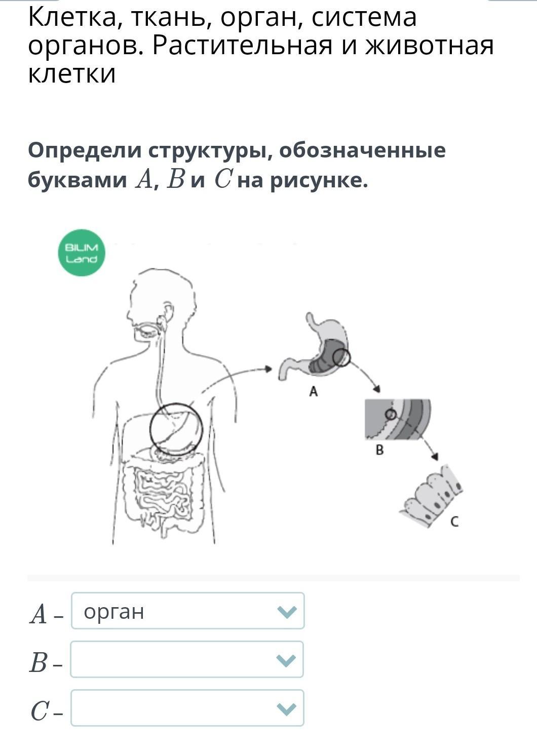 Клетка, ткань, орган, система органов. Растительная и животная клетки Определи структуры, обозначенные буквами A, B и C на рисунке.  A – орган B – C – Назад Проверить