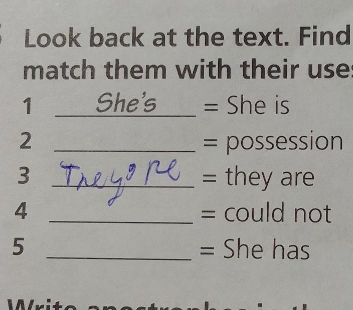 The man wheelchair. (because) = 5 Look back at the text. Find apostrop match them with their uses. 1 She's She is 2. = possession 3 4 = could not 5 She has Tre yo pe = they are
