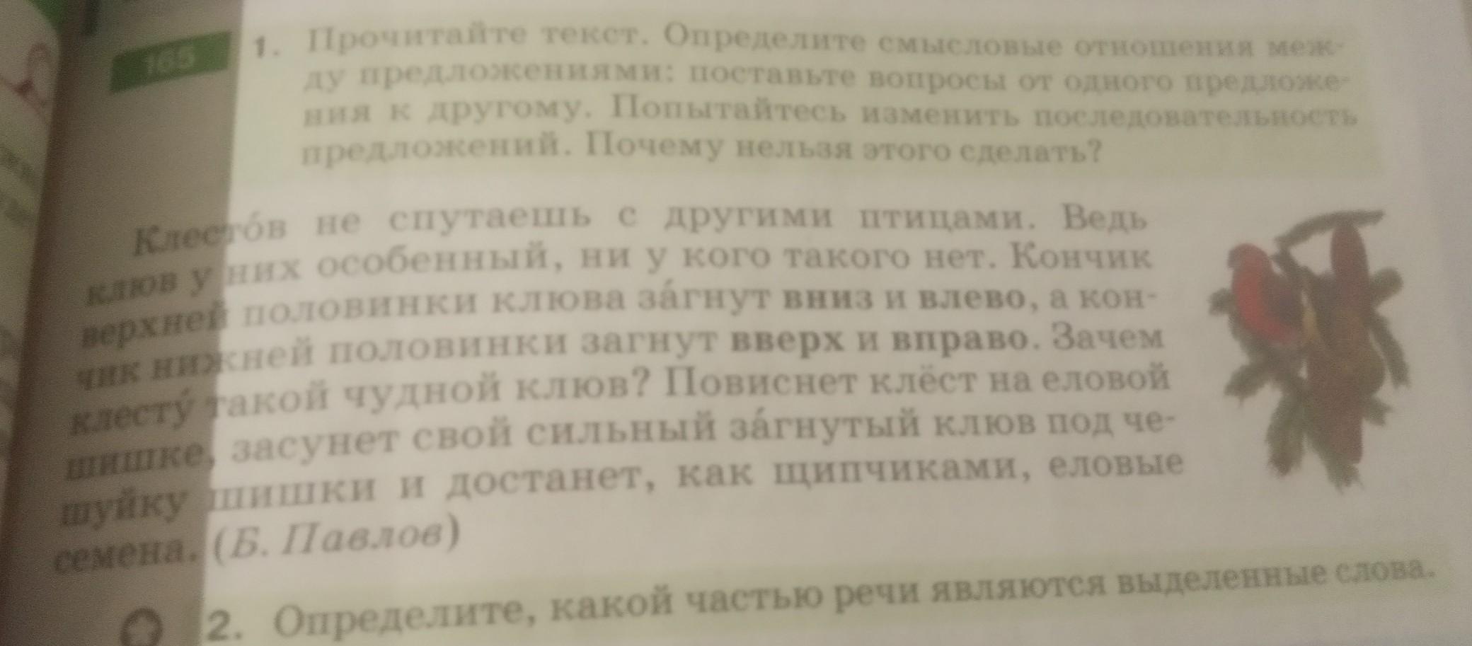 165 1. Прочитайте текст. Определите смысловые отношения меж- ду предложениями: поставьте вопросы от одного предложе- ния к другому. Попытайтесь изменить последовательность предложений. Почему нельзя этого сделать? Клетов не спутаешь с другими птицами. Ведь клов у них особенный, ни у кого такого нет. Кончик верхней половинки клюва загнут вниз и влево, а кон- чик никней половинки загнут вверх и вправо. Зачем клесту такой чудной клюв? Повиснет клёст на еловой шишке, засунет свой сильный загнутый клюв под че- шуйку шишки и достанет, как щипчиками, еловые семена. (Б. Павлов) 2. Определите, какой частью речи являются выделенные слова. (нужно только второе.)