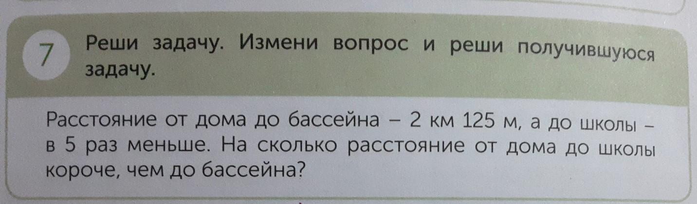 Реши задачу Измени вопрос и реши получившуюся задачу. Расстояние от дома до бассейна 2 км 125 м а до школы в 5 раз меньше На сколько расстояние от дома до школы короче чем до бассейна
