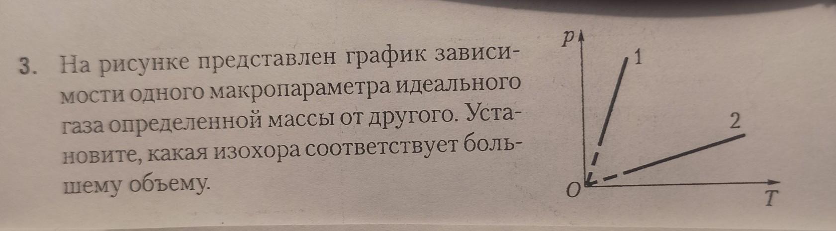 На рисунке представлен график зависимости одного макропараметра идеального газа определенной массы от другого. Установите, какая изохора соответствует боль шему объему.