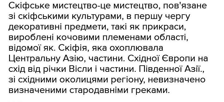 Завдання: Підготуйте інформацію про мистецтво скіфів, використовуючи додаткові джерела. Орієнтовні теми"Українська колекція скіфського золотарства", "Одяг скіфів". Порівняйте одяг і прикраси скіфів з античним, також- з українським національним костюмом .