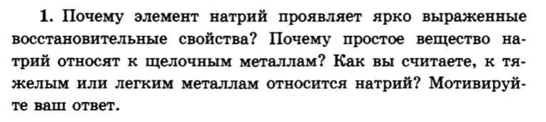 3)Натрий -легкий металл,т.к. это определяется его плотностью (сверху--->вниз плотность металлов увеличивается ).Плотность натрия меньше 5г/см^3.