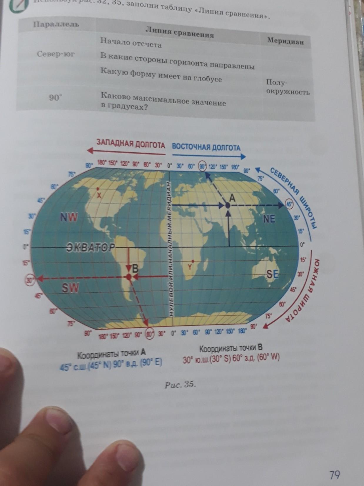 3) В качестве примера определения географических коорди- нат используй рис. 35.