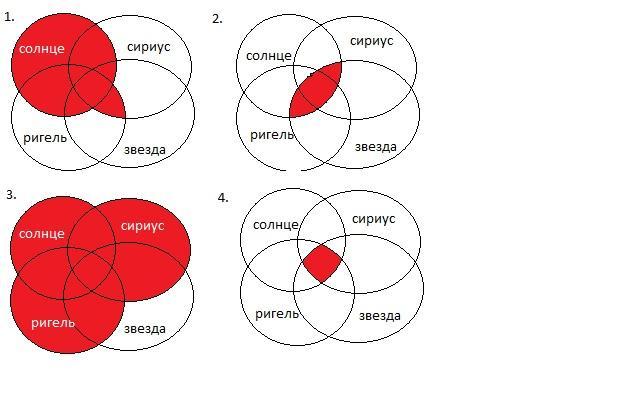 1) Слева рисуете круг в нем пишите солнце, справа отдельно рисуете пересечение двух других кругов пишите в пересечении сириус&ригель