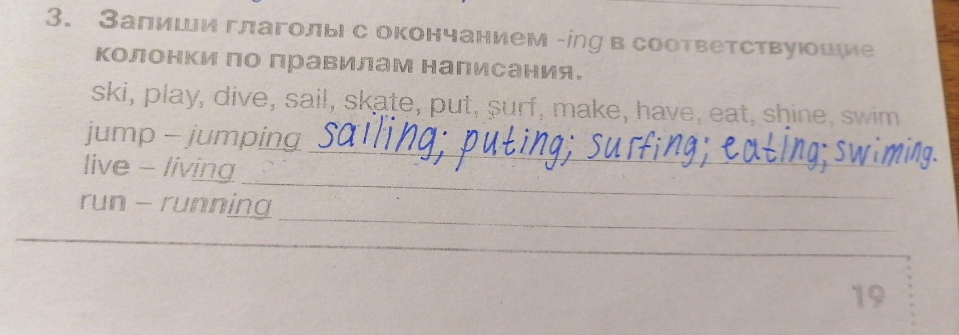 3. Запишали глаголы с окончанием -ing в соот IEA етствуюрине колонки по правилам написания ski, play, dive, sail, skate, put, surf, make, have, eat, shine, swim jump - jumping. Sailing, puting; surfing; eating; swiming. live - living run - running