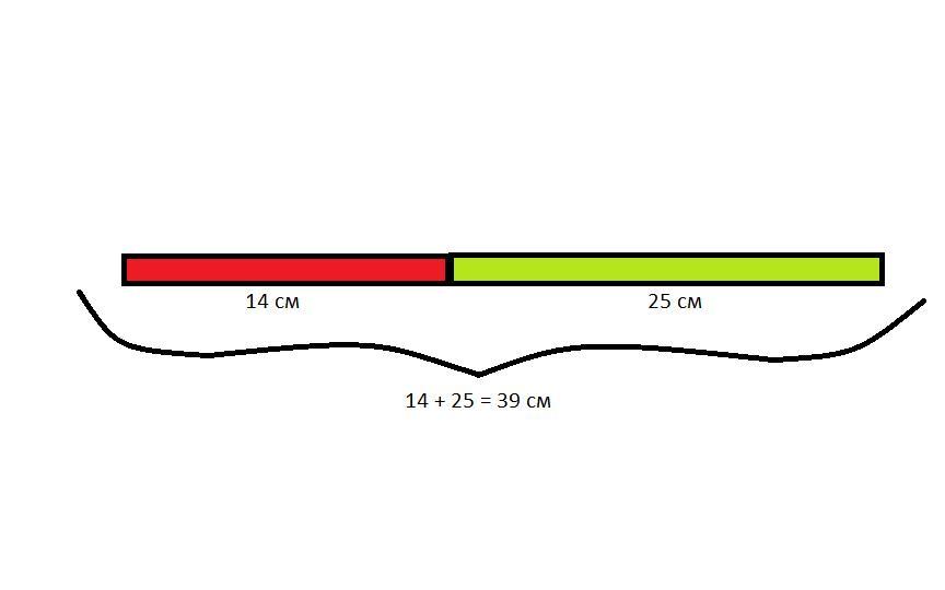 Айнур соединила концы двух лент длиной 25 см и 14 см.Сколько см составила длина полученной ленты?