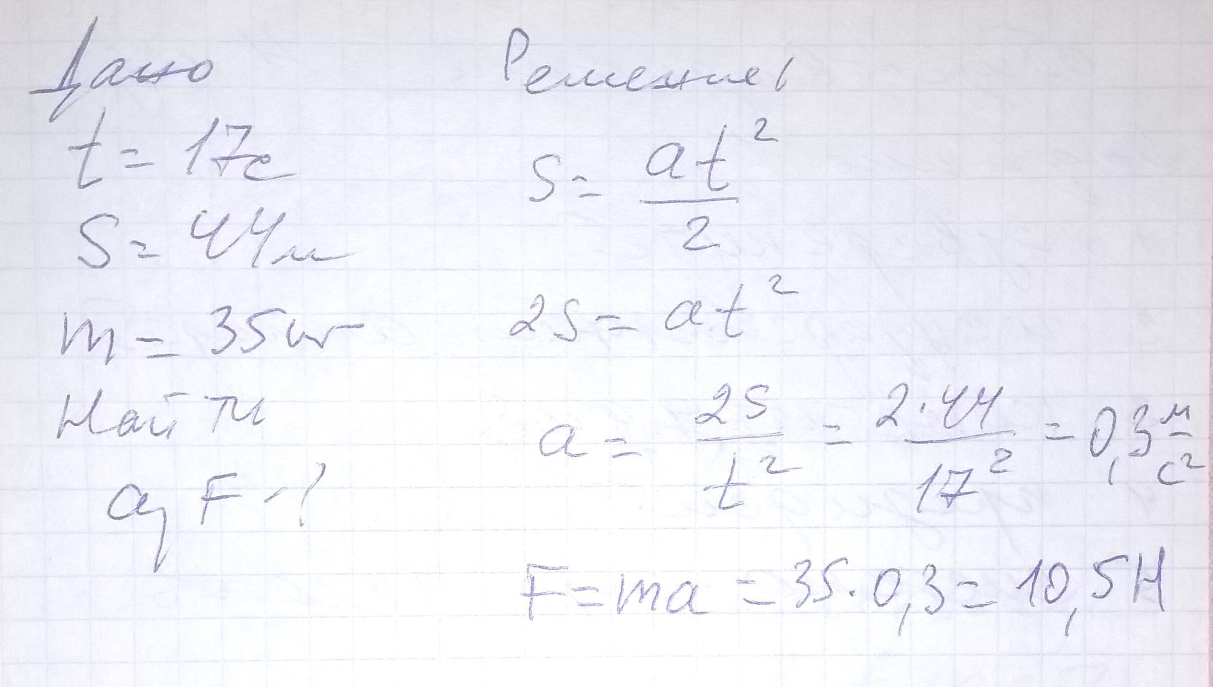 Санки с детьми начинают катиться с горы и, равномерно ускоряясь, через 17 с проезжают 44 м. Масса санок с детьми равна 35 кг.