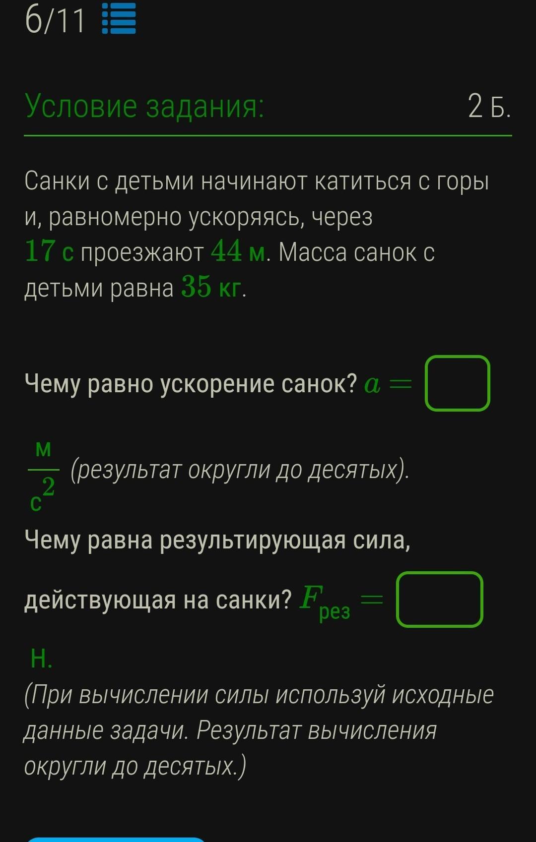 Чему равно ускорение санок? a = мс2 (результат округли до десятых). Чему равна результирующая сила, действующая на санки? Fрез = Н.