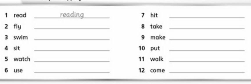 2. flying. 3.swimming. 4.sitting. 5.watching. 6.using. 7.hitting. 8.taking. 9.putting. 10.walking. 11.coming