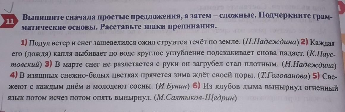 3. В марте снег не разлетается с руки, он загрубел, стал плотным. (основы- 1.снег не разлетается. 2. Он загрубел, стал)