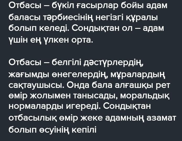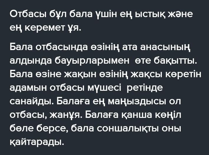 1. Әр отбасының өзіне тән ерекшелігі болуы мүмкін бе? 2. Бала өмірінде отбасының алатын орны туралы не ойлайсыз? 3. Отбасы бакытының құрылымы қандай?