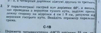 У паралелограмі гострий Кут дорівнює 60° , а висота що проведена з вершини тупого кута , поділяє протилежну сторону на відрізки 4 см і 9 см, рахуючи від вершини гострого кута. знайдіть периметр паралелограма