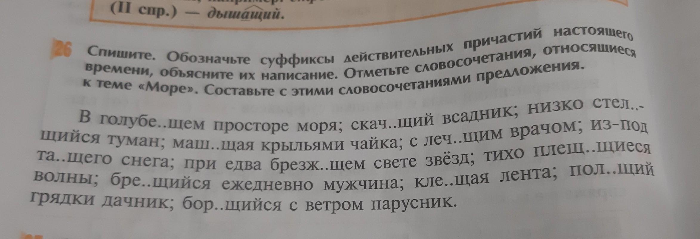 26 (ІІ спр.) — дышащий. Спишите. Обозначьте суффиксы действительных причастий настоящего времени, объясните их написание. Отметьте словосочетания, относящиеся к теме «Море». Составьте с этими словосочетаниями предложения. щийся туман; маш..щая крыльями чайка; с леч..щим врачом; из-под В голубе..щем просторе моря; скач..щий всадник; Низко стел..- та..щего снега; при едва брезЖ..щем свете звёзд; тихо плещ..щиеся волны; бре..щийся ежедневно мужчина; Кле..щая лента; пол..ЩИЙ грядки дачник; бор..щийся с ветром парусник.