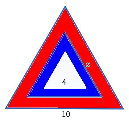 Сергей придумал эмблему нового прибора в виде трёх правильных треугольников, имеющих общий центр и попарно параллельные стороны. При этом Сергей хочет добиться, чтобы отношение площади синей части эмблемы к красной части составляло 3:4. Какой длины должна быть сторона среднего треугольника, если стороны внутреннего и внешнего треугольников равны 4 см и 10 см соответственно? Ответ в сантиметрах округлите до двух знаков после запятой. При вводе числа целую и дробную части разделить запятой. Обозначение единиц измерения не вводить!